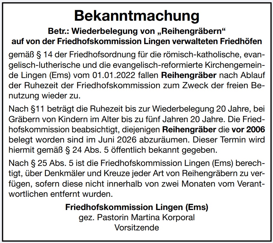 Reihengrabstätten die vor 2006 belegt wurden, werden im Juni 2026 durch die Mitarbeiter der Friedhofskommission Lingen eingebenet.